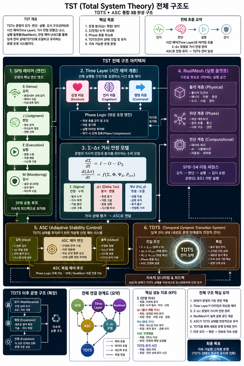 - 변동성 지표($\Delta\tau$): 시스템의 붕괴 위기를 나타내며, 안정성($\Sigma$)과 완충력($\Psi d$), 그리고 외부 변수($P_{ext}$)의 상관관계 함수로 정의됩니다.